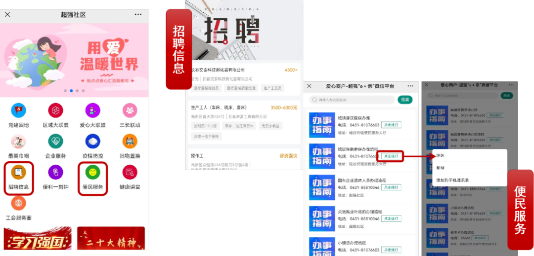 便民服務不僅體現在線下驛站,更體現在線上平臺。“只要點開‘e+親’,不出家門便能盡知社區大小事。”提起長春新區高新開發區硅谷街道超強社區創建的小程序,居民全都贊不絕口。小程序內設招聘信息、便民服務、工會服務圈等板塊內容共計15項,信息一目了然、辦事指南內容詳細。自小程序推廣已累計服務事項1000余次,覆蓋居民8000人。不僅促進了社區的服務資源互融互通,也讓轄區居民獲得感成色更足、幸福感更可持續、安全感更有保障。