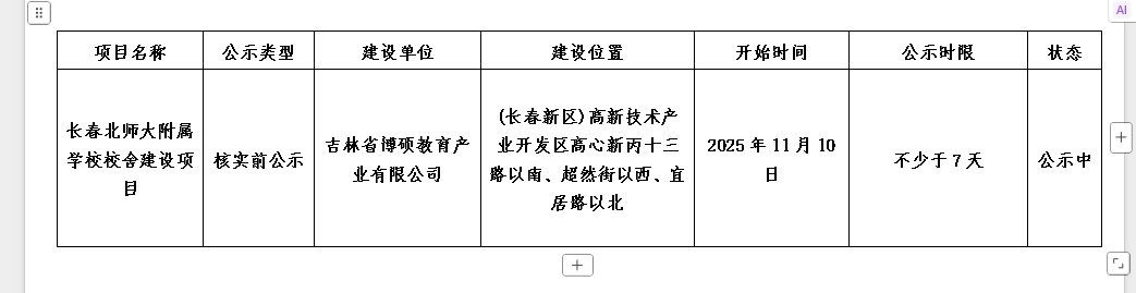 吉林省博碩教育產業有限公司長春北師大附屬學校校舍建設項目規劃核實前公示