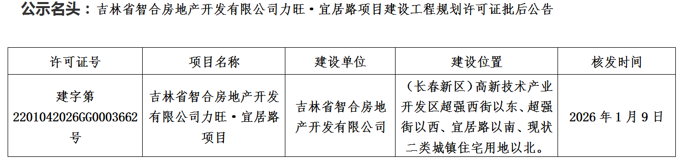 吉林省智合房地產開發有限公司力旺·宜居路項目建設工程規劃許可證批后公告
