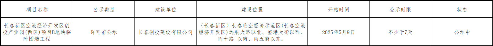 長春新區空港經濟開發區創投產業園(西區)項目B地塊臨時圍墻工程行政審批批前公示