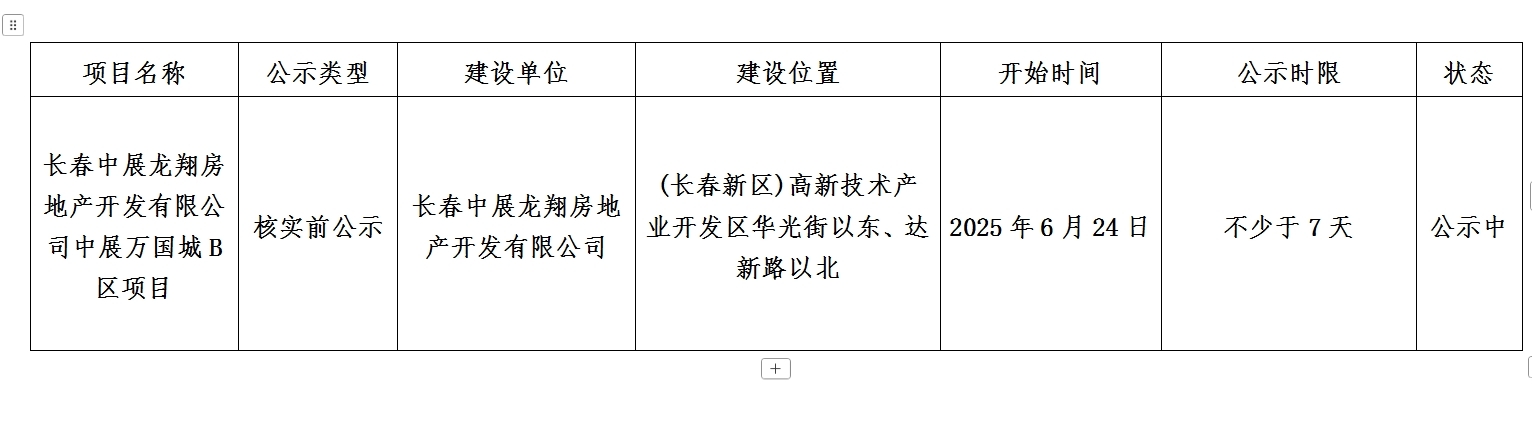 長春中展龍翔房地產開發有限公司中展萬國城B區項目規劃核實前公示