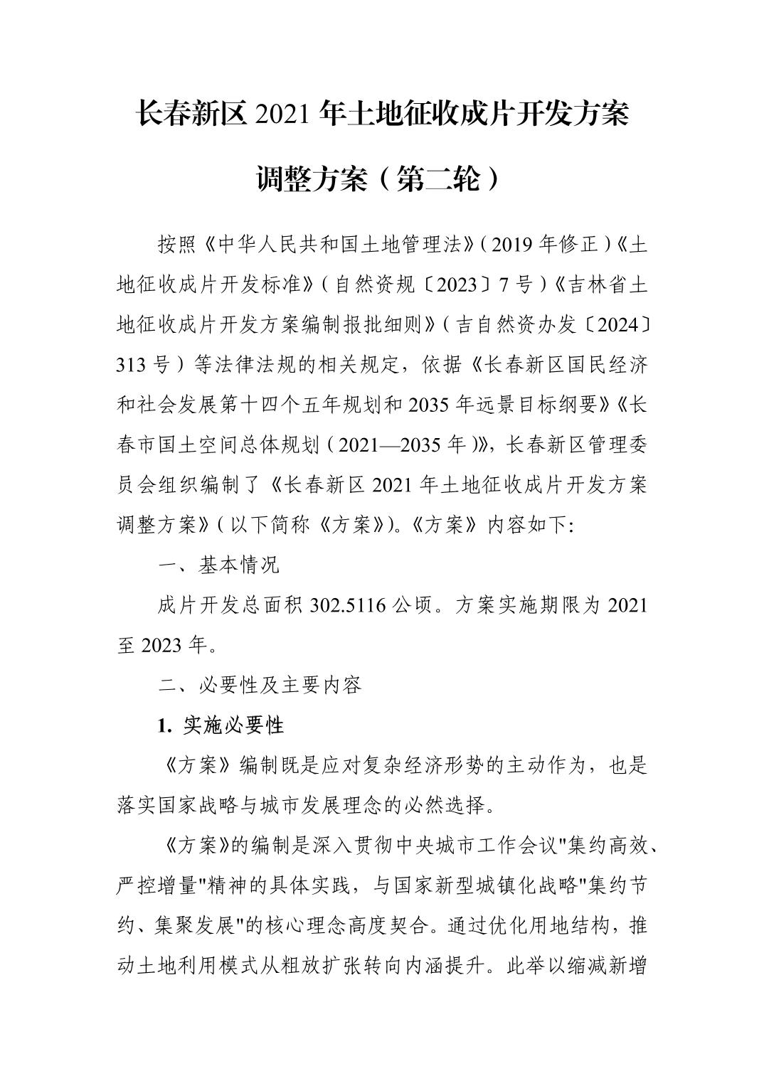 按照《中華人民共和國土地管理法》(2019年修正)《土地征收成片開發(fā)標(biāo)準(zhǔn)》(自然資規(guī)〔2023〕7號)《吉林省土地征收成片開發(fā)方案編制報批細(xì)則》(吉自然資辦發(fā)〔2024〕313號)等法律法規(guī)的相關(guān)規(guī)定,長春新區(qū)管理委員會組織編制了《長春新區(qū)2021年土地征收成片開發(fā)方案調(diào)整方案(第二輪)》。現(xiàn)將方案主要內(nèi)容進(jìn)行公示,向社會廣泛征求意見。在公示期間,公眾可通過以下途徑和方式提出反饋意見。