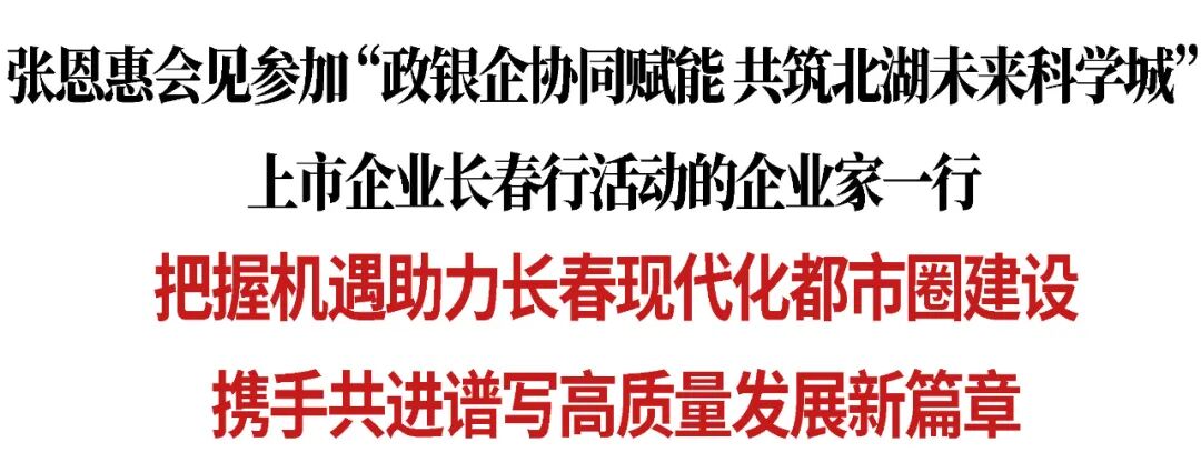 11月14日,市委書記張恩惠會(huì)見了參加“政銀企協(xié)同賦能 共筑北湖未來科學(xué)城”上市企業(yè)長春行活動(dòng)的企業(yè)家一行。