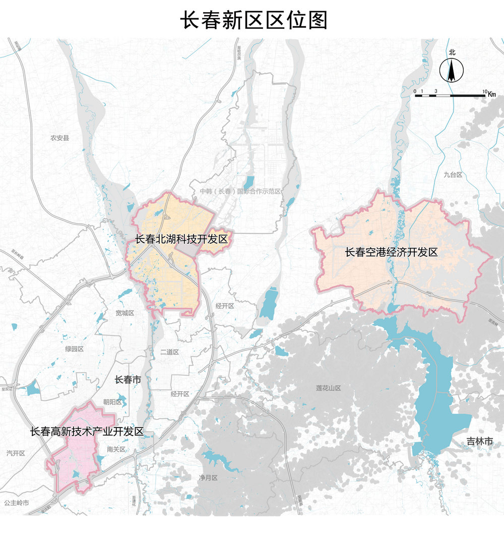 長春新區是國務院于2016年2月批復設立的第17個國家級新區,也是吉林省唯一的國家級新區,由長春高新技術產業開發區、長春臨空經濟示范區、長春北湖科技開發區組成,管轄面積428平方公里,下轄1個鄉、7個街道、39個行政村、50個社區,常住人口約56萬人,正廳級建制,享有副省級行政管理權限。